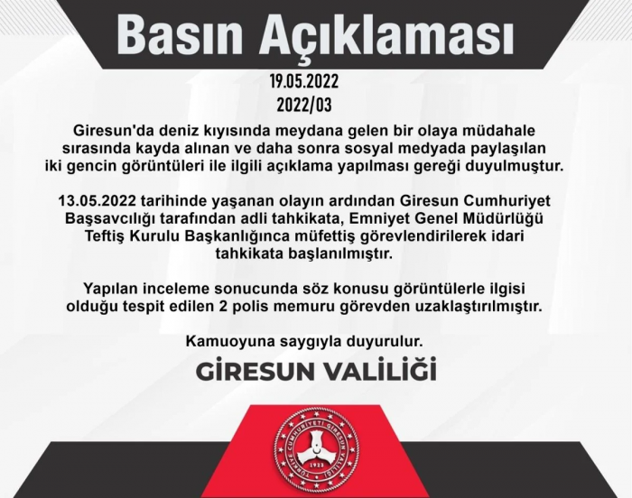 Giresun Valiliği, konuyla ilgili yazılı açıklamada bulunarak, polislerin, görevlerinden uzaklaştırıldığı belirtildi. Açıklamada, "Giresun'da deniz kıyısında meydana gelen bir olaya müdahale sırasında kayda alınan ve daha sonra sosyal medyada paylaşılan iki gencin görüntüleri ile ilgili açıklama yapılması gereği duyulmuştur. 13.05.2022 tarihinde yaşanan olayın ardından Giresun Cumhuriyet Başsavcılığı tarafından adli tahkikata, Emniyet Genel Müdürlüğü Teftiş Kurulu Başkanlığınca müfettiş görevlendirilerek idari tahkikata başlanılmıştır. Yapılan inceleme sonucunda söz konusu görüntülerle ilgisi olduğu tespit edilen 2 polis memuru görevden uzaklaştırılmıştır" denildi.