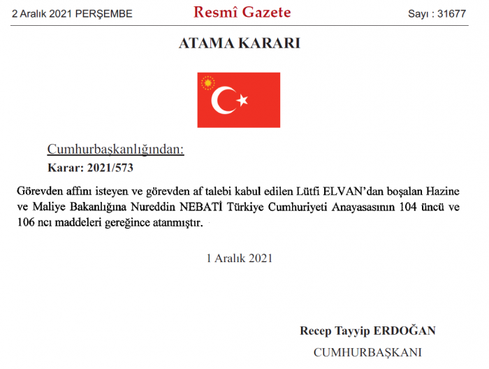 Hazine ve Maliye Bakanı Lütfi Elvan istifa etti. Yerine Nureddin Nebati getirildi.