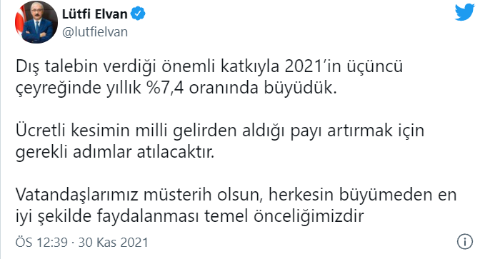 "Dış talebin verdiği önemli katkıyla 2021’in üçüncü çeyreğinde yıllık %7,4 oranında büyüdük. Ücretli kesimin milli gelirden aldığı payı artırmak için gerekli adımlar atılacaktır. Vatandaşlarımız müsterih olsun, herkesin büyümeden en iyi şekilde faydalanması temel önceliğimizdir."