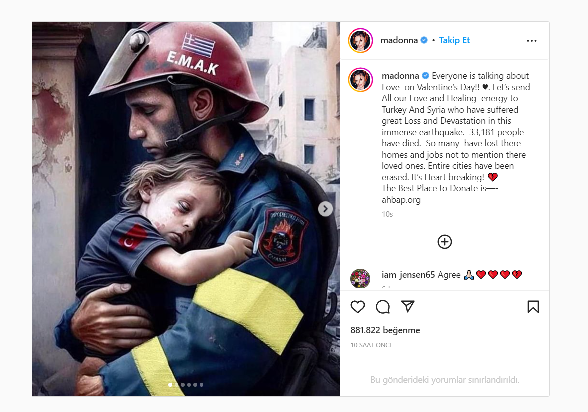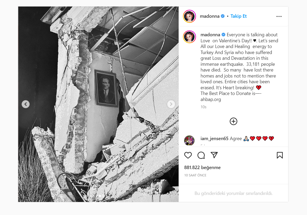 Madonna paylaşımının sonuna, "The Best Place to Donate is—-ahbap.org" (bağış yapabileceğiniz en iyi yer ahbap.org) ifadesini yazdı.