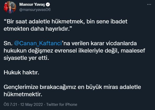 “Bir saat adaletle hükmetmek, bin sene ibadet etmekten daha hayırlıdır." Sn. Canan Kaftancıoğlu'na verilen karar vicdanlarda hukukun değişmez evrensel ilkeleriyle değil, maalesef siyasetle yer etti. Hukuk haktır. Gençlerimize bırakacağımız en büyük miras adaletle hükmetmektir."