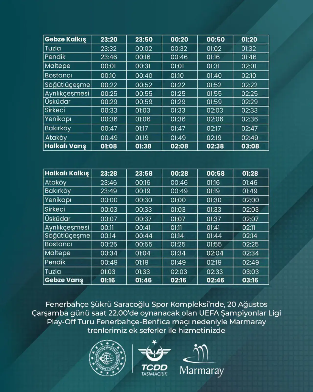 “Fenerbahçe Şükrü Saracoğlu Spor Kompleksi’nde, 20 Ağustos Çarşamba günü saat 22.00’de oynanacak UEFA Şampiyonlar Ligi Play-Off Turu Fenerbahçe-Benfica karşılaşması nedeniyle Marmaray Gebze-Halkalı hattında ek tren seferleri düzenlenecektir. Şampiyonlar Ligi temsilcimiz Fenerbahçe’ye başarılar dileriz.”
