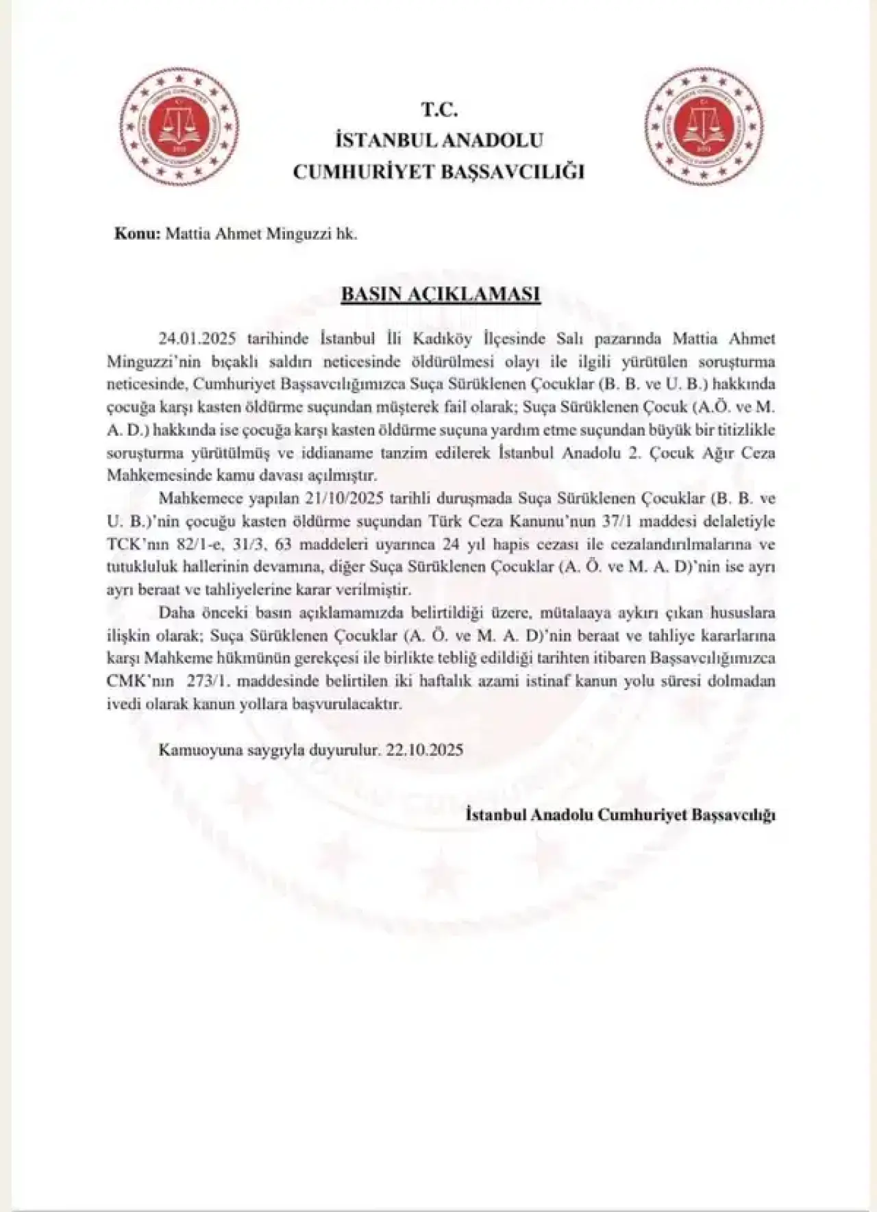 İstanbul Anadolu Cumhuriyet Başsavcılığı, Mattia Ahmet Minguzzi cinayeti davasında beraat eden A.Ö. ve M.A.D. hakkında, kararın mütalaaya aykırı olduğunu belirterek istinaf başvurusu yapılacağını açıkladı.