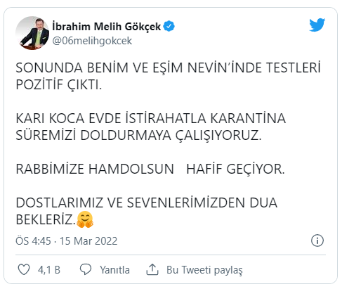 Melih Gökçek, koronavirüse yakalandıklarını sosyal medya hesabından duyurdu. Melih Gökçek, hastalığı hafif geçirdiklerini belirterek şu ifadeleri kullandı: