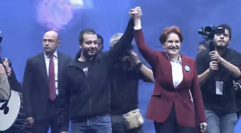 Akşener, partisinin 6. yıl dönümü kutlamalarında sahneye dün tahliye edilen Aykırı Genel Yayın Yönetmeni Batuhan Çolak ile çıktı.