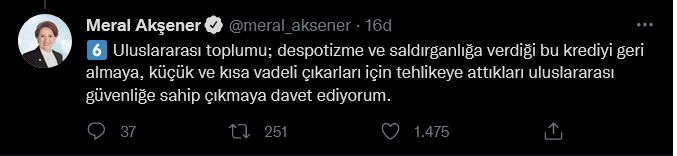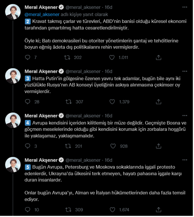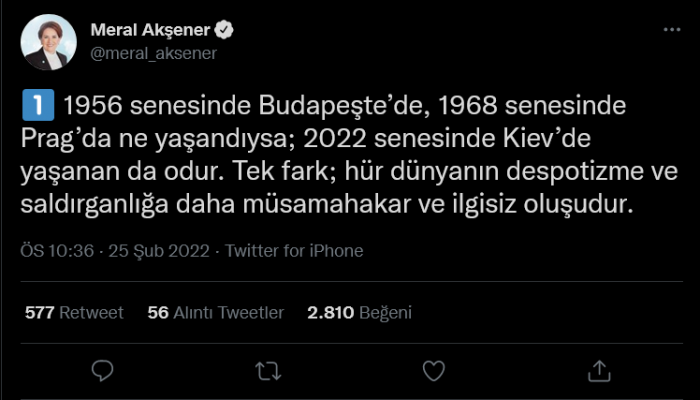 Meral Akşener, "Putin'in gölgesine özenen yavru tek adamlar"ın Rusya'nın AB Konseyi üyeliğiin askıya alınmasında çekimse oy verdiğini belirtti. Akşener, Rusya'da işgali protesto eden ve ülkesini terk etmeyen Ukraynalıların Avrupa'yı Alman ve İtalyan hükümetlerinden daha fazla temsil ettiğini dile getirdi. Akşener'in paylaşımları şöyle: