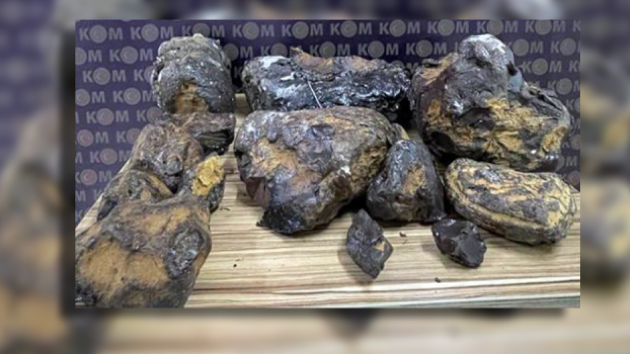 Mersin'de "balina kusmuğu" olarak bilinen kozmetik sanayisinde kullanılan ve balina bağırsaklarından çıkartılan "ambergris" isimli taşlar ele geçirildi.