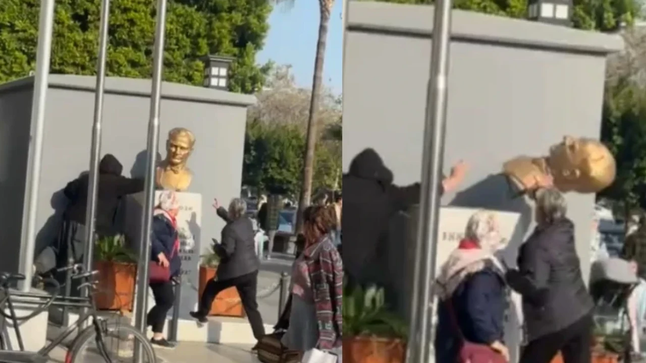 Saldırgan kişi, kendisine "Polise şikayet edeceğim seni" diyen bir kadına "Ara polisi" dedikten sonra bölgeden uzaklaşırken, başka bir kişi ise büstü kaldırıp yerine koydu.