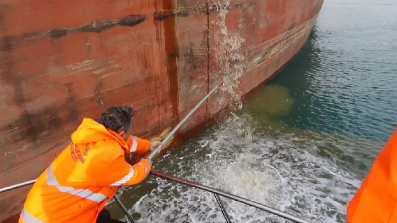 Mersin Büyükşehir Belediyesi Çevre Koruma ve Kontrol Başkanlığı ekipleri, denizi temiz tutmak için denetimlerini aralıksız sürdürüyor. Bu çerçevede havadan ve karadan incelemelerde bulunan ekipler, limana giriş için sıra bekleyen bir geminin denizi kirlettiğini gözlemledi.