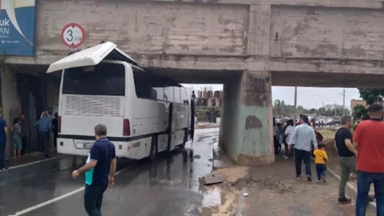 Hatay’ın Dörtyol ilçesinden Tarsusa gelen ilköğretim öğrencilerini taşıyan 80 ADC 023 plakalı tur otobüsü, Yüzbaşı Yaşar Caddesi’nde 3,50 metre yükseklik uyarısı bulunan üst geçide sıkıştı.