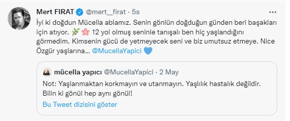 Oyuncu Mert Fırat, Twitter’daki paylaşımında "İyi ki doğdun Mücella ablamız. Senin gönlün doğduğun günden beri başakları için atıyor. 12 yıl olmuş seninle tanışalı ben hiç yaşlandığını görmedim. Kimsenin gücü de yetmeyecek seni ve biz umutsuz etmeye. Nice Özgür yaşlarına…" ifadelerine yer verdi.