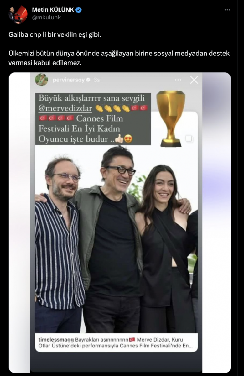 AK Parti Merkez Karar Yönetim Kurulu (MKYK) üyesi Metin Külünk, Cannes Film Festivali’nde ödül alan oyuncu Merve Dizdar’ı tebrik eden Kültür ve Turizm Bakanı Mehmet Nuri Ersoy’un eşi Pervin Ersoy’u hedef aldı.
