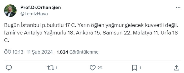 "Bugün İstanbul p.bulutlu 17 C. Yarın öğlen yağmur gelecek kuvvetli değil. İzmir ve Antalya Yağmurlu 18, Ankara 15, Samsun 22, Malatya 11, Urfa 18 C."