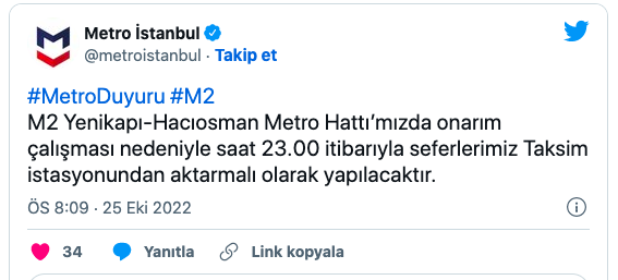 Metro İstanbul'un resmi Twitter hesabından, Yenikapı-Hacıosman Metro Hattı'nda onarım çalışması nedeniyle metro seferlerinin saat 23.00 itibarıyla Taksim istasyonundan aktarmalı olarak gerçekleştirileceği duyuruldu.  Bu duyuru, ‘’Taksim-Hacıosman istasyonları arasında normal işletme tarifesine uygun sefer yapılacak olup, Taksim-Yenikapı arasında ise tek hat üzerinden ring seferleri yapılacaktır.’’ bilgilendirilmesiyle açıklandı.
