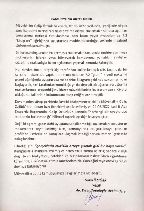 Muhalif. GÜNDEM Metro Turizm’in sahibi Galip Öztürk’ ün Avukatından açıklama ve uyuşturucu iddialarına karşı kan testi raporu