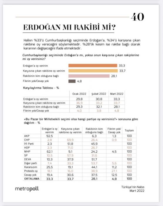 Öte yandan Metropoll, "Erdoğan'a oy veririm" diyenlerin oy oranının ocak ayından bu yana arttığını ortaya koydu. Ocak 2022'de bu oran yüzde 29,8 iken; Şubat 2022'de yüzde 30,8; Mart 2022'de de yüzde 33,3 oldu.