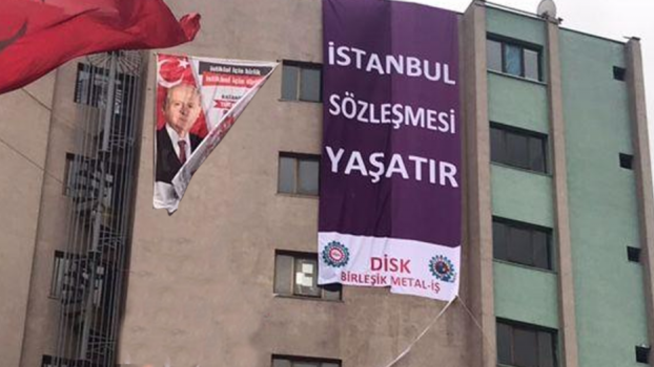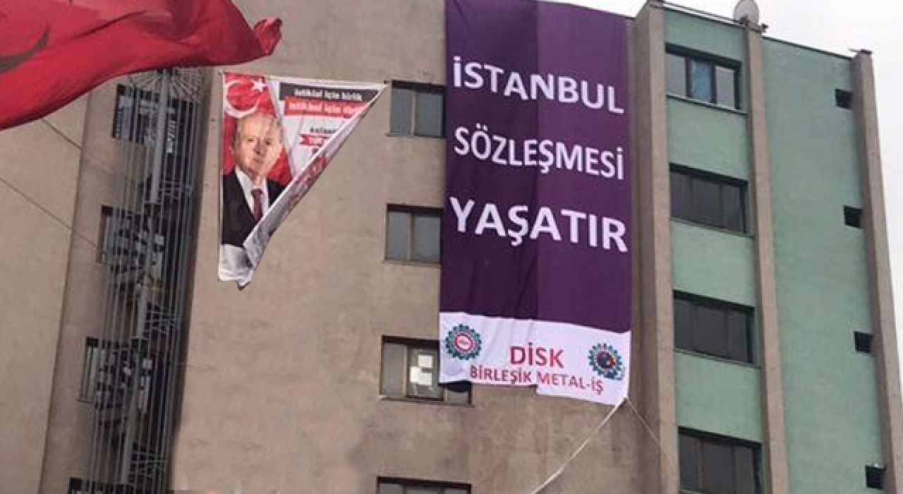Ancak DİSK, MHP'ye beklenmedik bir cevap verdi. Türkiye Devrimci İşçi Sendikaları Konfederasyonu'na bağlı olan Türk Metal Sendikası, MHP Kocaeli İl Teşkilatı'yla aynı iş merkezinde yer alıyor. Sendika, DİSK'e ait "İstanbul Sözleşmesi Yaşatır" afişini MHP Kocaeli İl Teşkilatı'nın da bulunduğu binaya astı. MHP'nin Genel Başkanı Devlet Bahçeli'nin fotoğrafının üstünde dalgalanan "İstanbul Sözleşmesi Yaşatır" sloganlı afiş oldukça dikkat çekti.