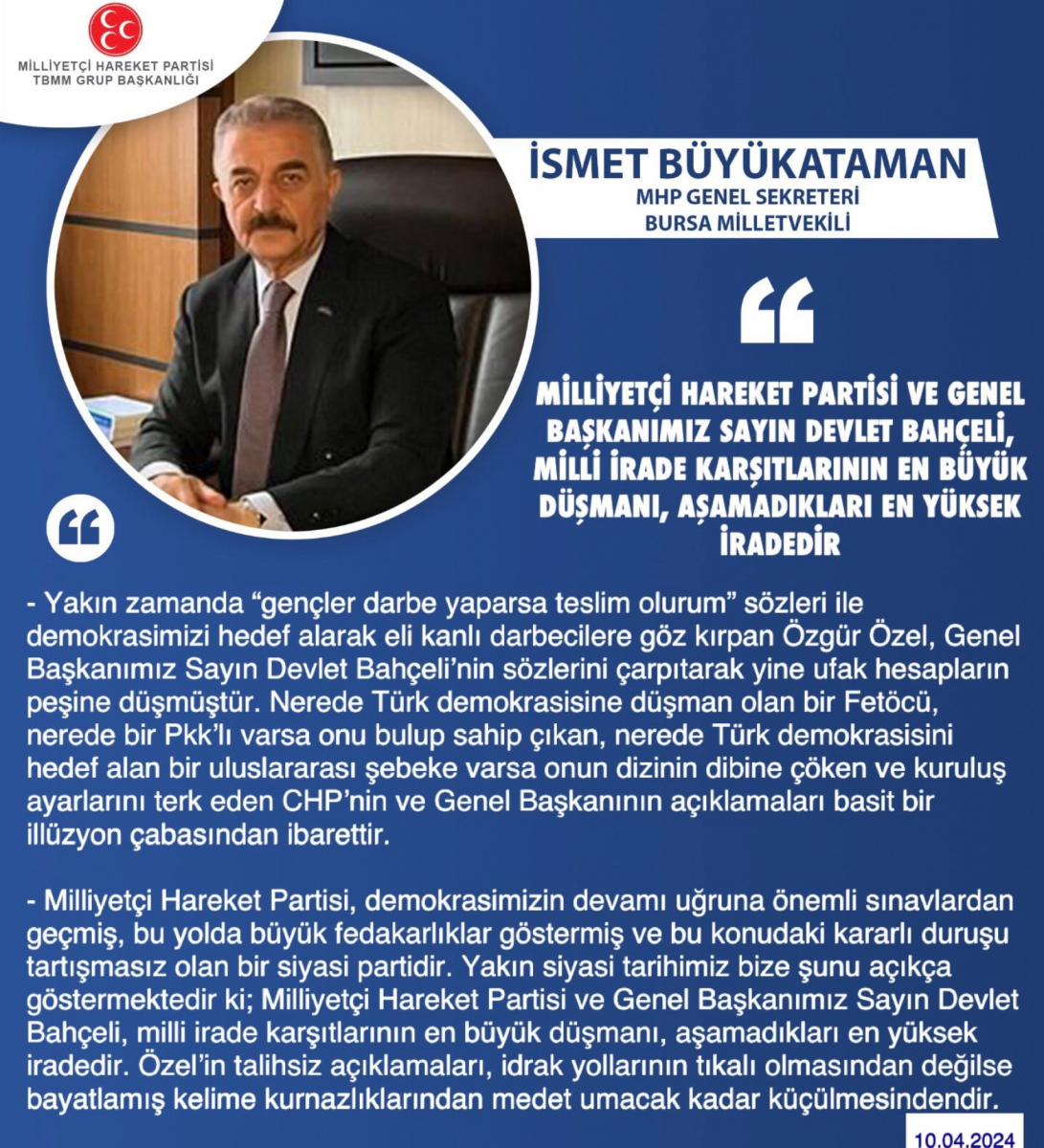 Milliyetçi Hareket Partisi, demokrasimizin devamı uğruna önemli sınavlardan geçmiş, bu yolda büyük fedakarlıklar göstermiş ve bu konudaki kararlı duruşu tartışmasız olan bir siyasi partidir. Yakın siyasi tarihimiz bize şunu açıkça göstermektedir ki; Milliyetçi Hareket Partisi ve Genel Başkanımız Sayın devlet Bahçeli, milli irade karşıtlarının en büyük düşmanı, aşamadıkları en yüksek iradedir. Özel'in talihsiz açıklamaları, idrak yollarının tıkalı olmasından değilse bayatlamış kelime kurnazlıklarından medet umacak kadar küçülmesindendir."