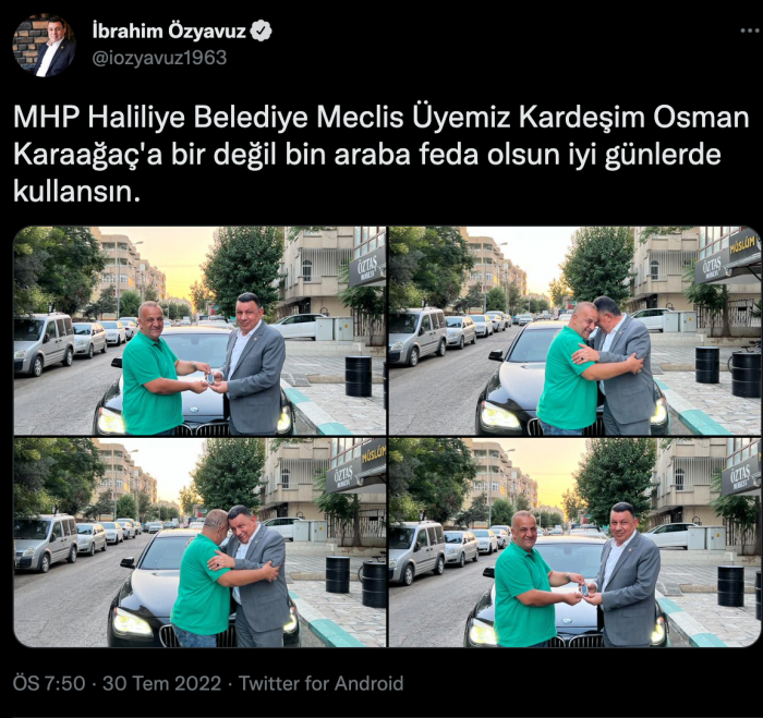 Özyavuz, 30 Temmuz tarihli paylaşımında "MHP Haliliye Belediye Meclis Üyemiz Kardeşim Osman Karaağaç'a bir değil bin araba feda olsun iyi günlerde kullansın" ifadelerini kullandı.