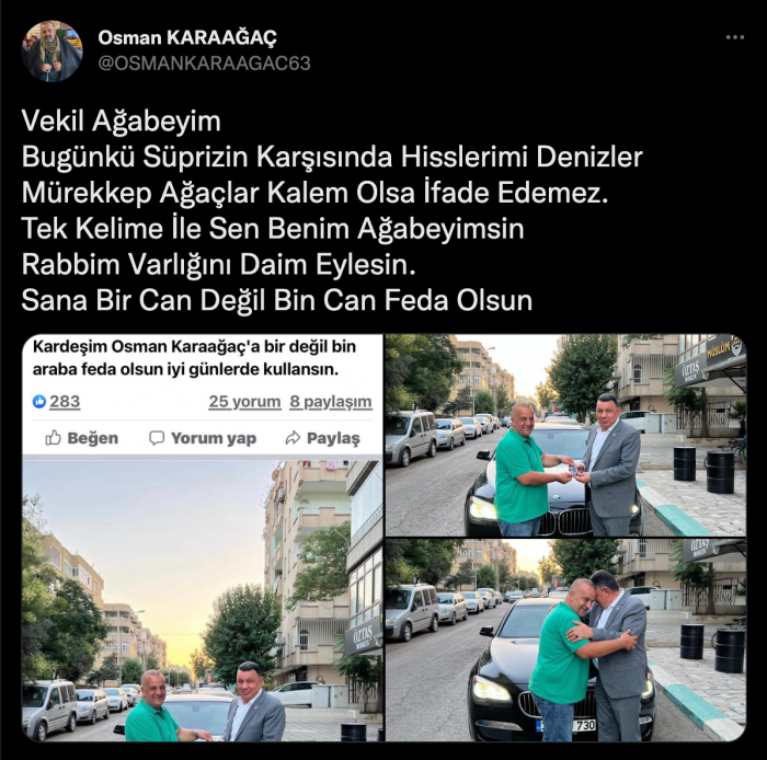 MHP Milletvekili İbrahim Özyavuz, MHP Haliliye Belediye Meclis Üyesi Osman Karaağaç'a lüks bir otomobilin anahtarını verdiği fotoğrafları "Kardeşime bir değil bin araba feda olsun" diye paylaştı.