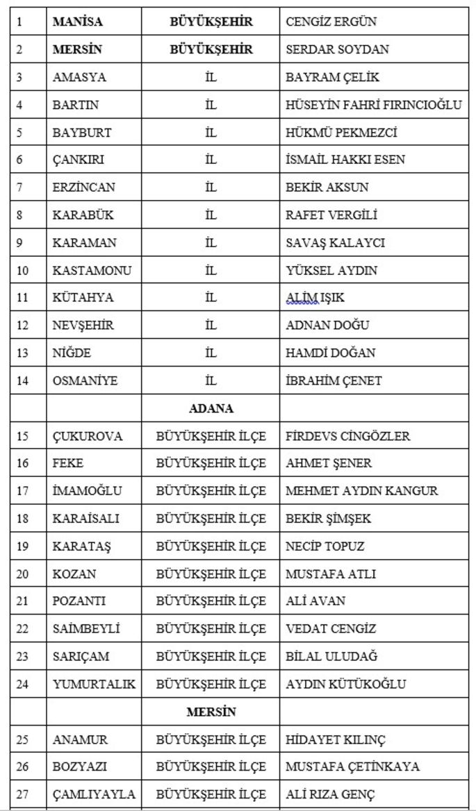 Buna göre Mersin büyükşehir belediye başkan adayı Serdar Soydan olurken, Manisa büyükşehir belediye başkan adayı da Cengiz Ergün olarak açıklandı.