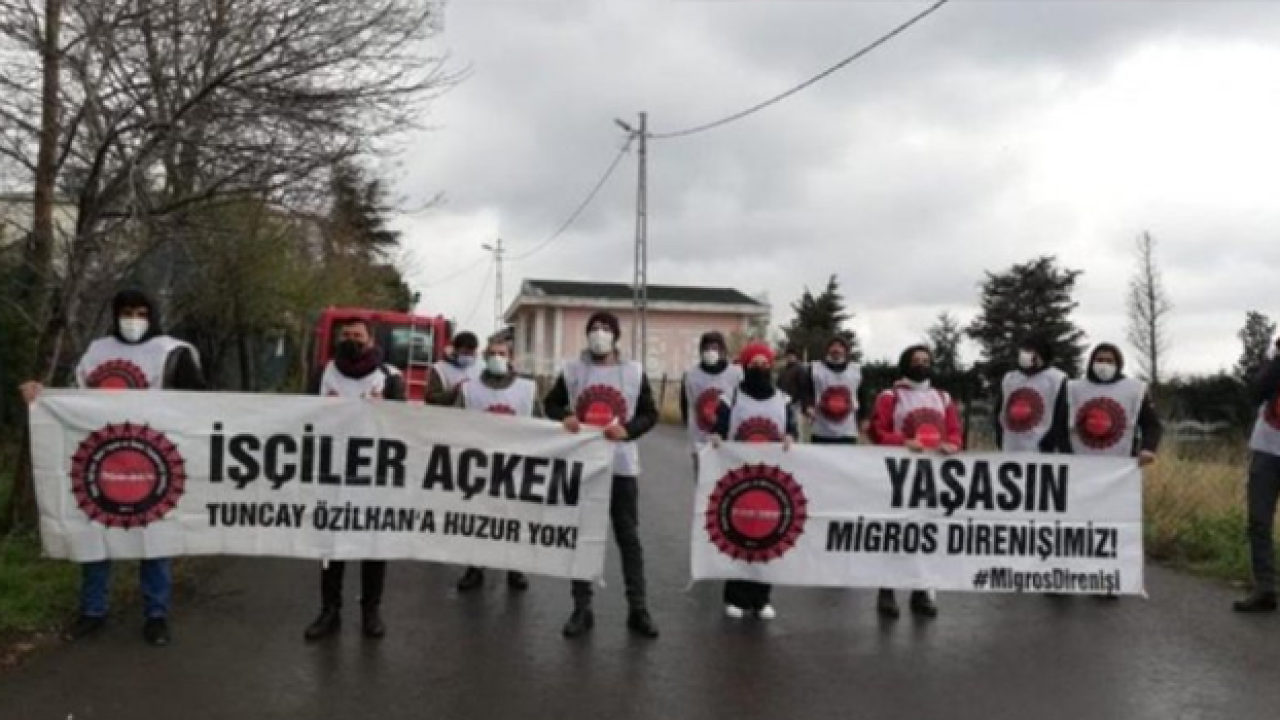 Patron Tuncay Özilhan'ın Beykoz'daki villası önünde "İşçiler açken Özilhan'a huzur yok", "Yaşasın Migros direnişimiz" pankartları açarak eylem yapan 16 işçi darp edilerek gözaltına alındı.