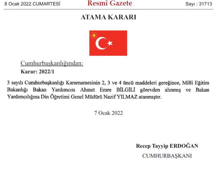 Milli Eğitim Bakanlığı Bakan Yardımcısı Ahmet Emre Bilgili görevden alındı. Bilgili’nin yerine Din Öğretimi Genel Müdürü Nazif Yılmaz atandı.
