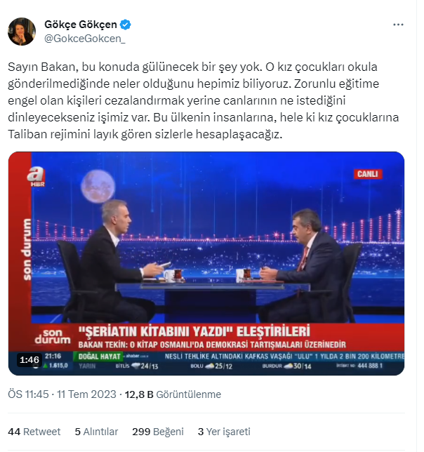 “Çıkış noktamız temel hak ve hürriyetler, demokrasi ve özgürlükler. Bahse konu olan tartışmada da bir gazeteciyle kız çocuklarının okullaşmasını konuşuyorduk. Kız çocuklarında okullaşma oranı düşük, istediğimiz seviyeye nasıl getirebiliriz şeyi var.