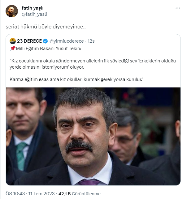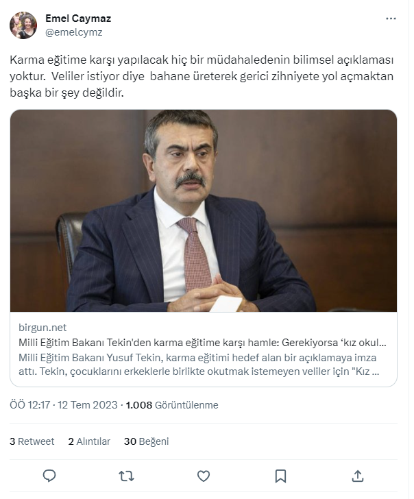Milli Eğitim Bakanı Yusuf Tekin, 2014’te, bakanlık müsteşarıyken karma eğitimin zorunlu olmadığını dile getirmişti: “Eğitimin karma olmasını zorunlu kılan bir düzenleme yok. imdi demokrasinin gereği olarak Milli Eğitim Bakanlığı, halk ne istiyorsa ona göre düzenlemelerini yapıyor. Halk siyasal iktidara egemen olduğu gibi, burada da halkın değerleri belirleyici olmaya başladı.”