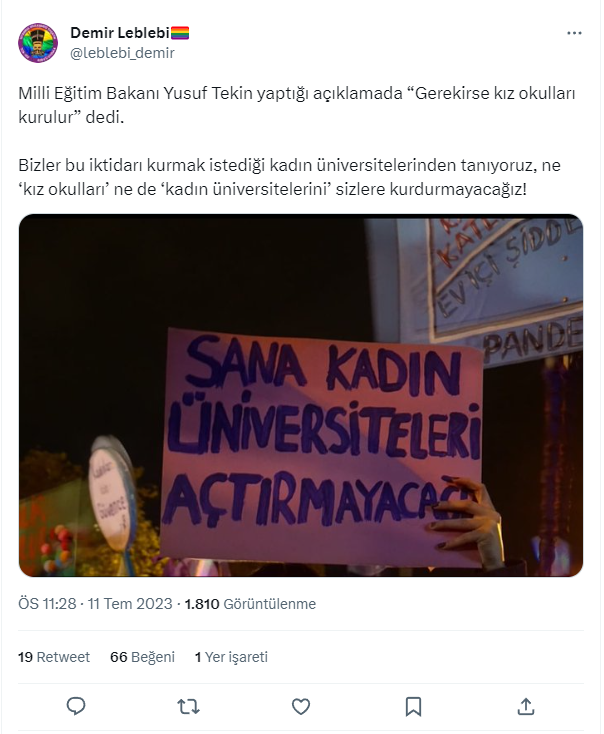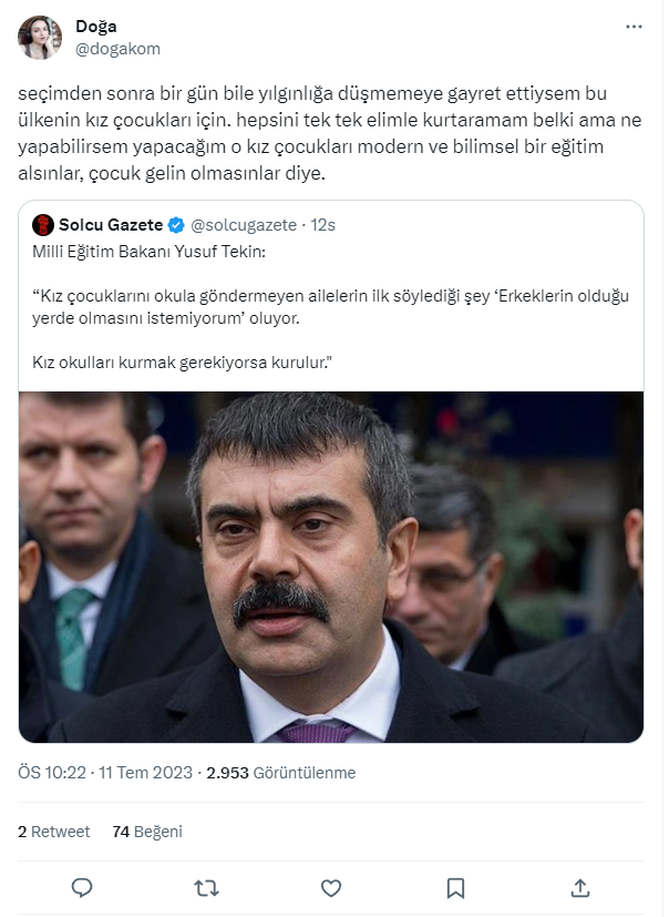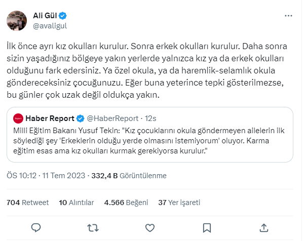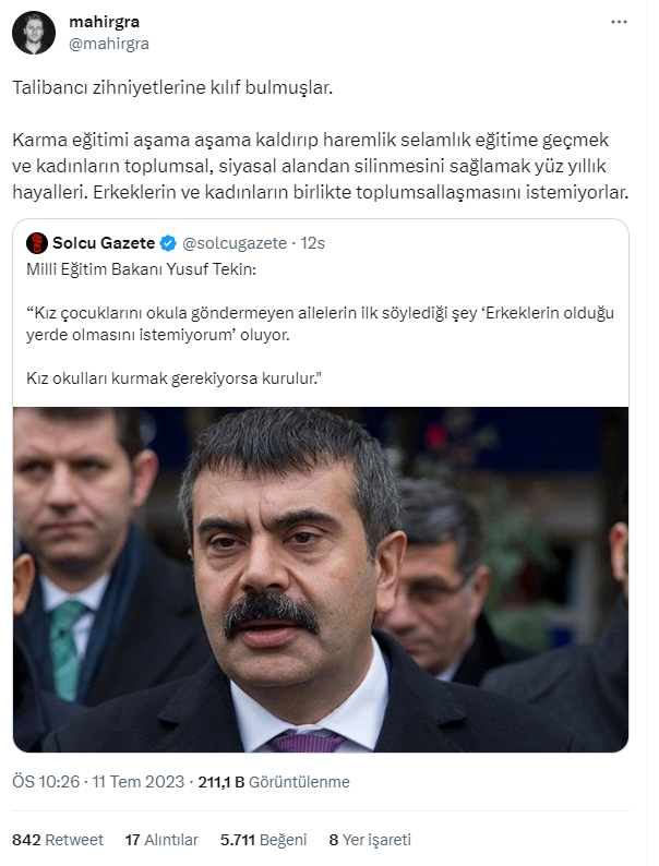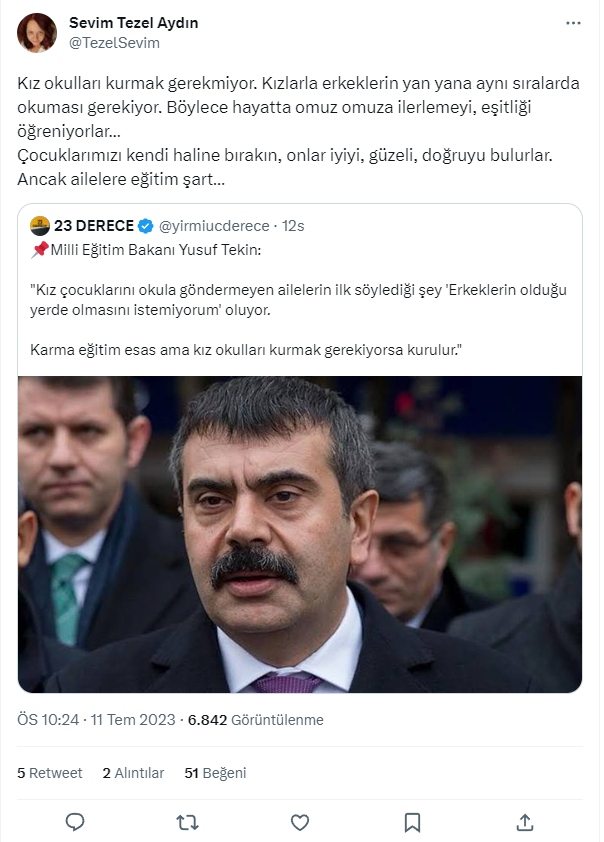 Karma eğitim esastır. Ama bu tür gerekçelerle yani eğitimin, okullaşma oranının artması için bu tarz tedbirlerin alınması gerekiyorsa alalım beraber. Buradan hareketle karma eğitime karşı olduğum söyleniyor. Tam tersine özgürlükçüyüm. Karma eğitim isteyen veriler için kuşkusuz o olacak. Ama benim asli görevim okullaşma oranını artırmak. Bunu gerekçe olarak ileri süren velilerin bu gerekçelerini ellerinden almamız gerekiyor. Dolayısıyla kız çocukları için böyle bir şey yapılabilir demiştim."