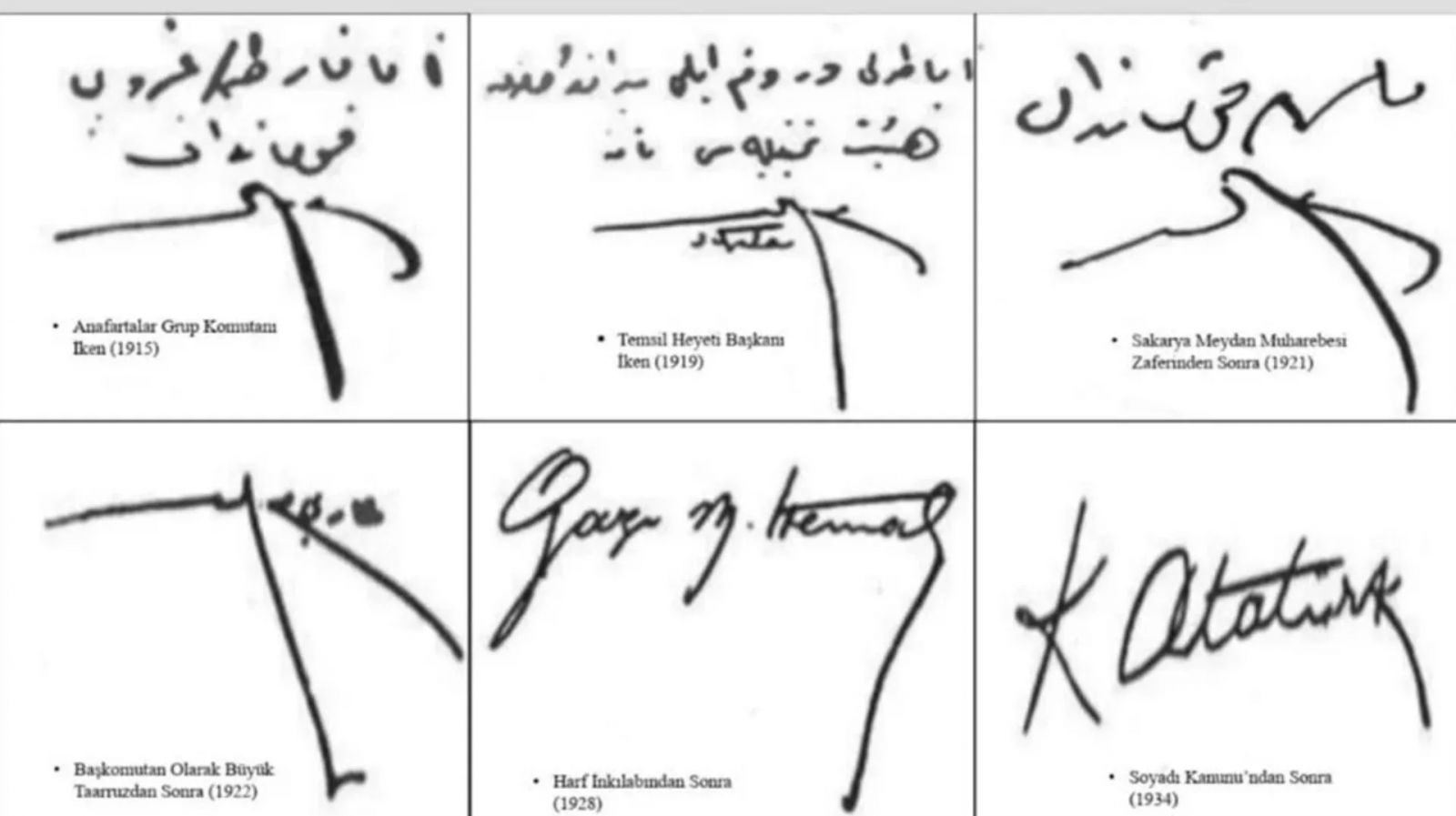 Arşiv ve Askeri Tarih Daire Başkanlığı Atatürk'ün 1915'te Anafartalar Grup Komutanıyken, 1919'da Temsil Heyeti Başkanıyken kullandığı imzalarla, Sakarya Meydan Muharebesi ile Büyük Taarruz sonrasında kullandığı imzaları da paylaştı.