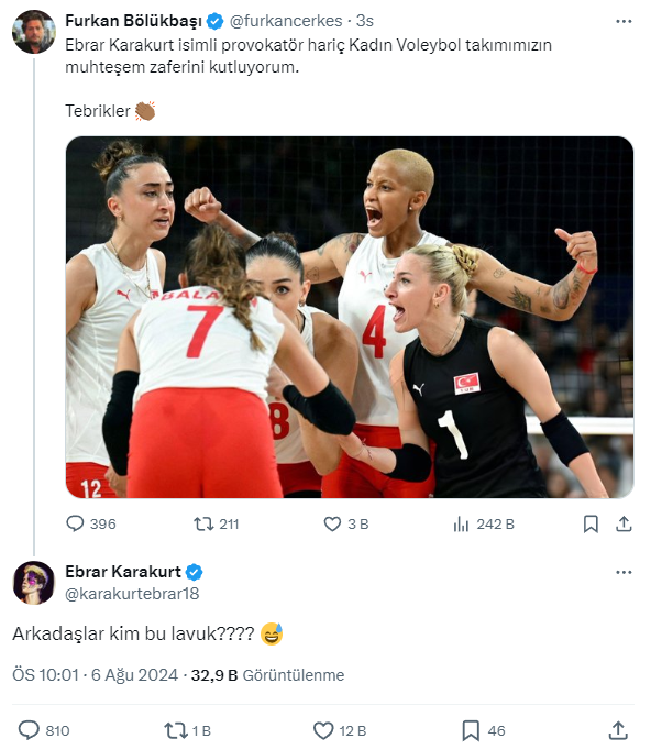 AK Parti trolü olarak bilinen Furkan Bölükbaşı'nın A Milli Kadın Voleybol Takımı'nın fotoğrafını sosyal medyada paylaşarak “Ebrar Karakurt isimli provokatör hariç Kadın Voleybol takımımızın muhteşem zaferini kutluyorum” sözleri sosyal medyada büyük tepki çekti.