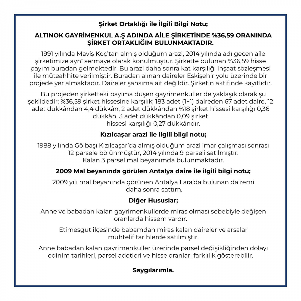 Altınok bugün sosyal medya hesabından mal varlığını açıkladı. Çok sayıda arsa, tarla ve evi olduğu görülen Altınok açıklamasında "Ekte sunduğum tüm mal varlığım ana sütü gibi ak ve helaldir" dedi. açıklama şöyle: