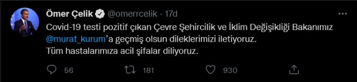 AK Parti Sözcüsü ve Genel Başkan Yardımcısı Ömer Çelik, Twitter hesabından Çevre, Şehircilik ve İklim Değişikliği Bakanı Murat Kurum'un Kovid-19'a yakalandığını açıkladı. Çelik'in paylaşımı şöyle: