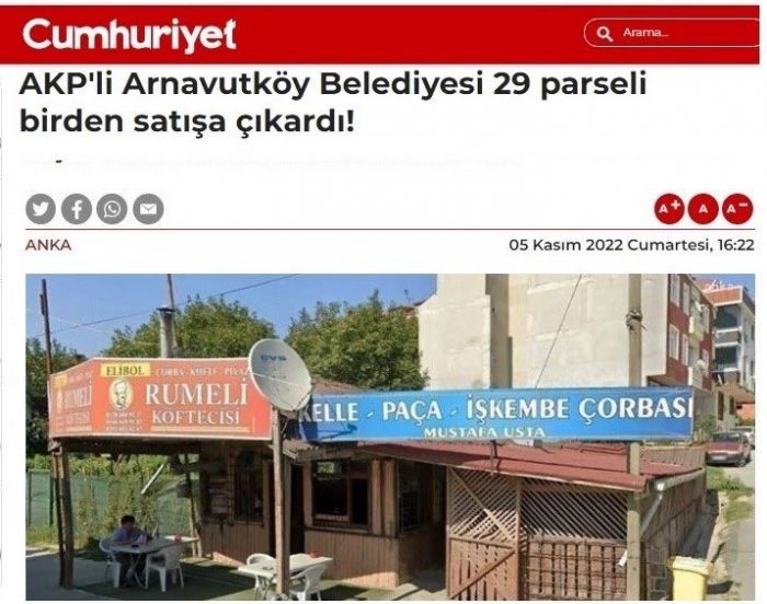 AKP, İBB'nin kaynak yaratmak için satmak istediği arsaları, İBB Meclisi’ndeki çoğunluğunu kullanarak engellerken, AKP’li Eyüpsultan Belediyesi, Kemerburgaz’daki 78 bin 563 metrekarelik iki ayrı parseli 756 milyon TL muhammen bedelle satışa çıkardı.