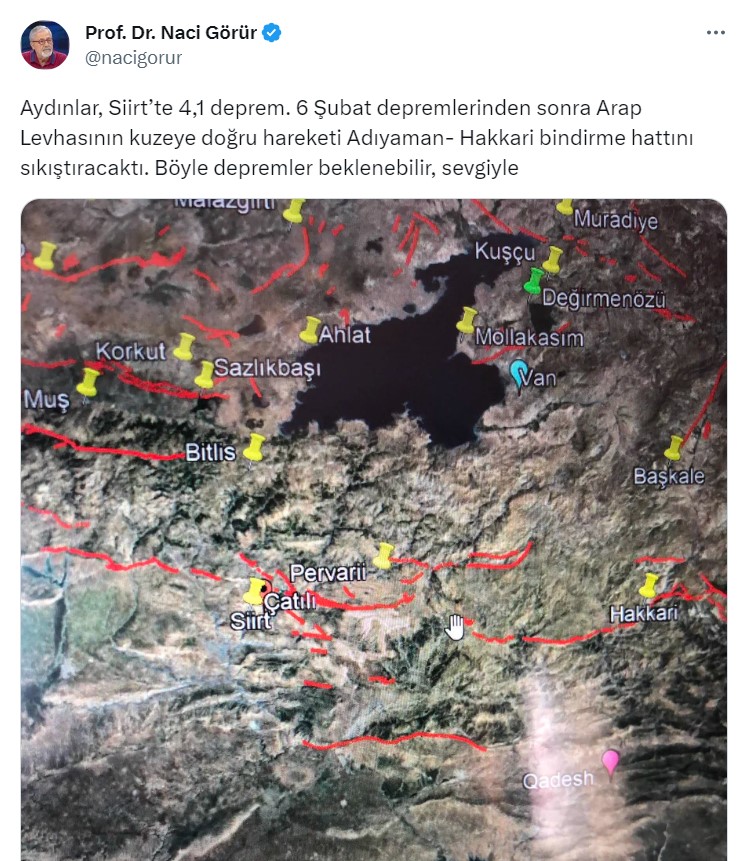 "Aydınlar, Siirt’te 4,1 deprem. 6 Şubat depremlerinden sonra Arap Levhasının kuzeye doğru hareketi Adıyaman- Hakkari bindirme hattını sıkıştıracaktı. Böyle depremler beklenebilir, sevgiyle"