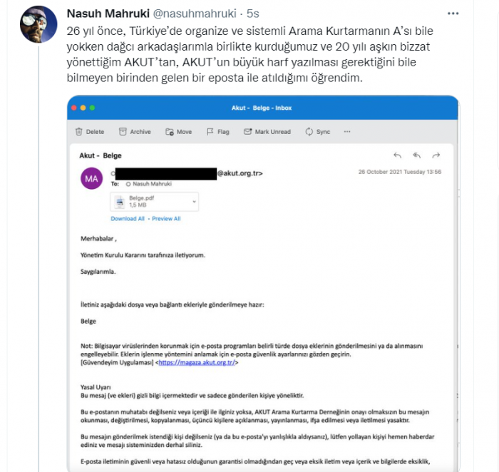 2016'da Yönetim Kurulu Başkanlığı'ndan istifa eden Nasuh Mahruki, 2019'da ise Onursal Başkanlık'tan istifa etmişti. Mahruki, kurucusu olduğu AKUT'tan e-postayla 'atıldığını' paylaştı.