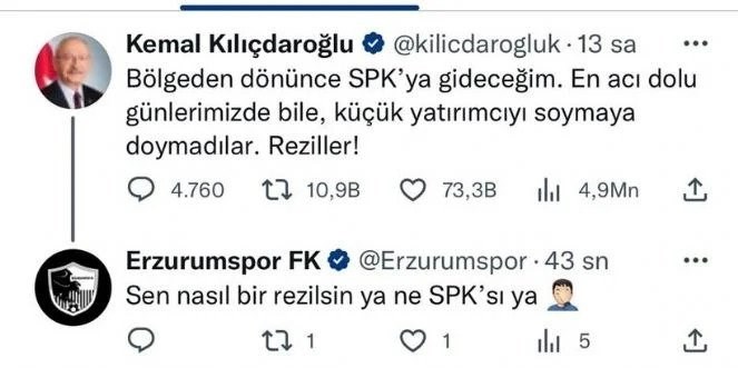 Erzurumspor ise resmi Twitter hesabından Kılıçdaroğlu'nu hedef alarak, "Sen nasıl bir rezilsin ya ne SPK’sı ya" ifadelerini kullandı.