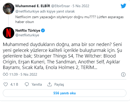 “Muhammed duydukların doğru, ama bir sor neden” diye yazan Netflix, zammın nedeninin yüzlerce yeni kaliteli içerik üretmek olduğunu belirtti.