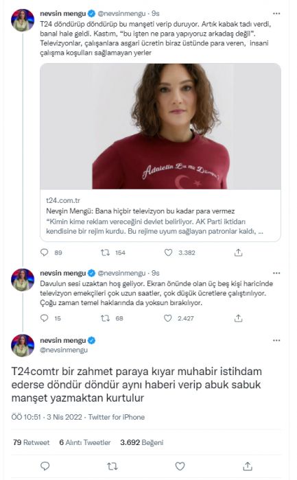 Mengü tepkisini, "T24 döndürüp döndürüp bu manşeti verip duruyor. Artık kabak tadı verdi, banal hale geldi. Kastım, “bu işten ne para yapıyoruz arkadaş değil”. Televizyonlar, çalışanlara asgari ücretin biraz üstünde para veren, insani çalışma koşulları sağlamayan yerler. Davulun sesi uzaktan hoş geliyor. Ekran önünde olan üç beş kişi haricinde televizyon emekçileri çok uzun saatler, çok düşük ücretlere çalıştırılıyor. Çoğu zaman temel haklarında da yoksun bırakılıyor. T24comtr bir zahmet paraya kıyar muhabir istihdam ederse döndür döndür aynı haberi verip abuk sabuk manşet yazmaktan kurtulur." diyerek belirtti.