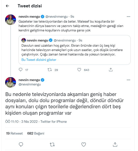 Mengü sözlerinin devamında; "Gazeteler ise televizyonlardan da beter. Malesef bu koşullarda bir habercinin dünya basınını ve yazınını takip etme, mesleğinin gereği olan kendini geliştirme koşullarını oluşturma şansı yok. Bu nedenle televizyonlarda akşamları geniş haber dosyaları, dolu dolu programlar değil, döndür döndür aynı konuları çılgın teorilerle değerlendiren dört beş kişiden oluşan programlar var." dedi.