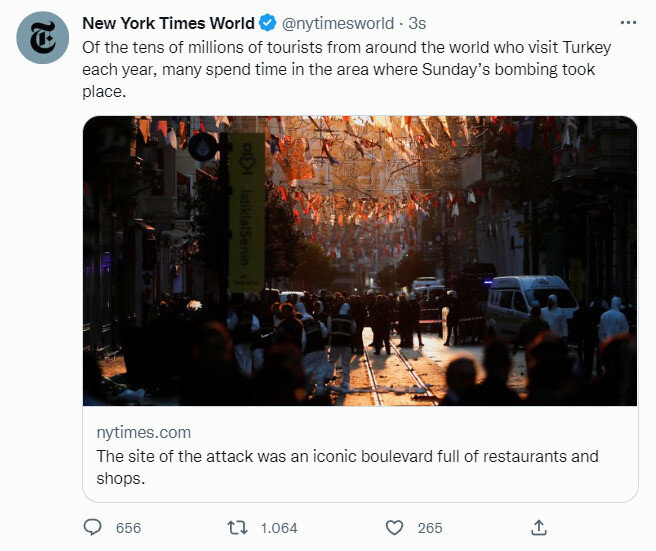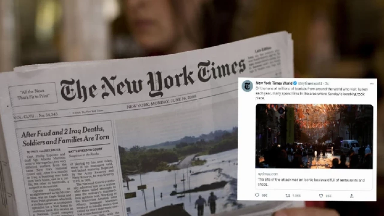 İstanbul Beyoğlu'nda bulunan İstiklal Caddesi'nde gerçekleştirilen bombalı saldırıya ilişkin haber Amerikan günlük gazetesi New York Times tarafından algı çalışması yürütülerek servis edildi. Yapılan saldırıya ilişkin haberi sosyal medya hesabından paylaşan New York Times, paylaşımında "Türkiye'ye giden turistlerin en çok gezdiği yer" ifadelerini kullandı.