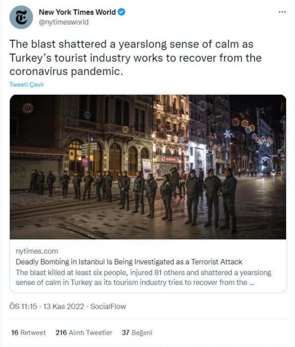 New York Times'ın resmi Twitter hesabında yer alan paylaşımda, "Her yıl dünyanın dört bir yanından Türkiye'yi ziyaret eden on milyonlarca turistin çoğu, pazar günkü bombalamanın gerçekleştiği bölgede vakit geçiriyor." denildi.
