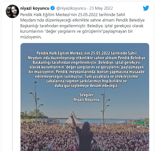 Müzisyen Niyazi Koyuncu, Pendik Halk Eğitim Merkezi'nin 25 Mayıs'ta Sahil Meydanı'nda düzenleyeceği etkinlikte sahne almasının AK Partili Pendik Belediyesi tarafından engellendiğini duyurdu.