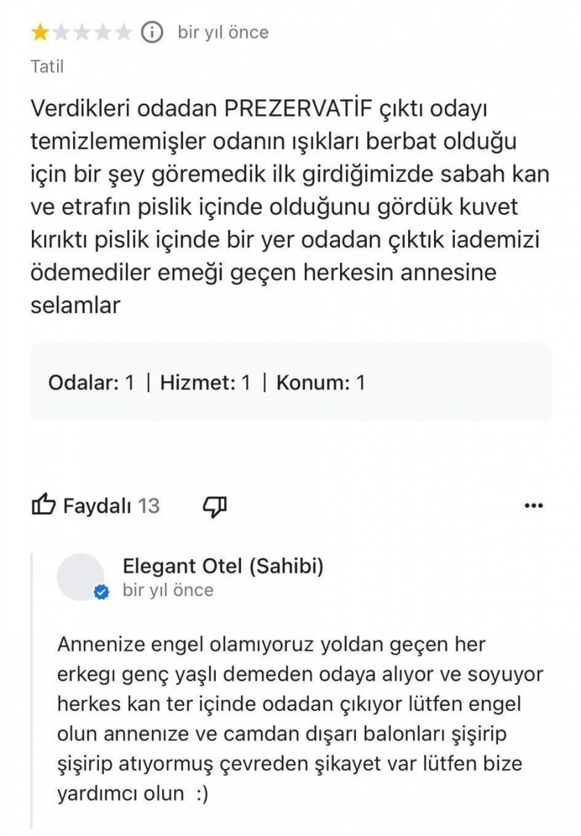 Bir otel için "Odadan prezervatif çıktı." diyen müşteriye, işletme sahibi tarafından "Annenize engel olamıyoruz." şeklinde cevap verildi.