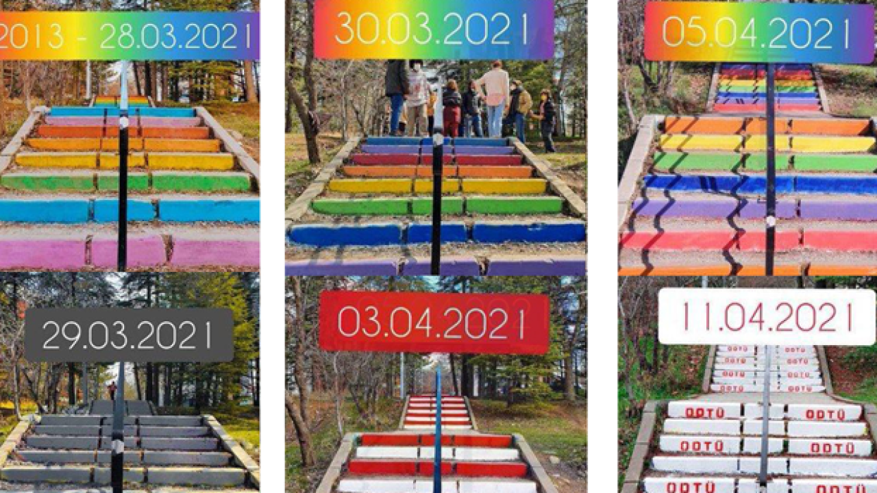 ODTÜ yönetimi, dün akşam bir kez daha öğrencilerin gökkuşağı renklerine boyadığı merdivenleri beyaza boyadı. Konuya ilişkin Mezopotamya Ajansı’ndan Hakan Yalçın’a konuşan ODTÜ'lü öğrenciler, renklendirmelerin temelinde üniversiteler üzerindeki baskı ve denetimin artmasına dikkat çekmek, antidemokratik uygulamalara son verme çağrısının olduğunu belirtti.