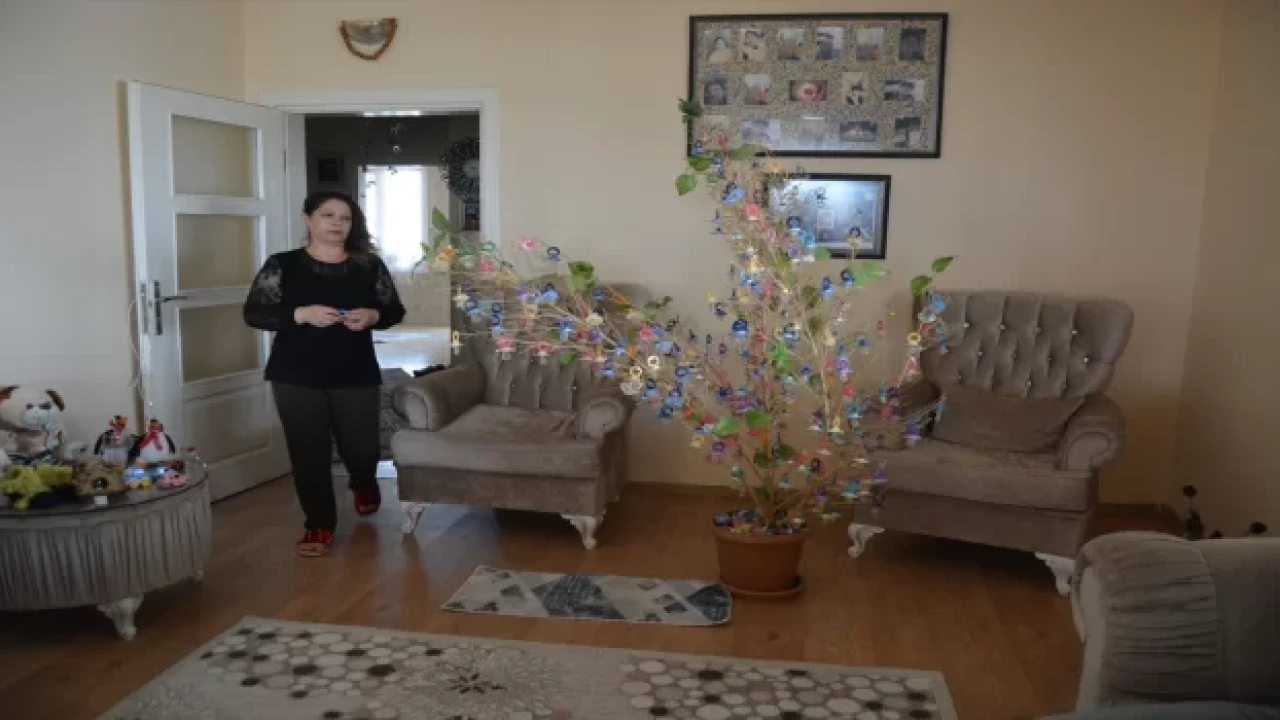 GAZİANTEP (AA) Gaziantep'in Nurdağı ilçesinde yaşayan üç çocuk annesi, sağlık problemleri olan küçük oğlunun 12 yıldır kullandığı emziklerle, evinde süs ağacı yaptı.