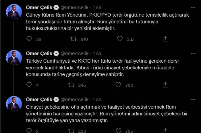 AK Parti Sözcüsü ve Genel Başkan Yardımcısı Ömer Çelik, Twitter'dan Güney Kıbrıs Rum Yönetimi'nin (GKRY) PKK/PYD terör örgütüne temsilcilik açmasına tepki göstererek, "Terör yandaşı bir tutum almıştır" dedi. Ömer Çelik'in paylaşımı şöyle: