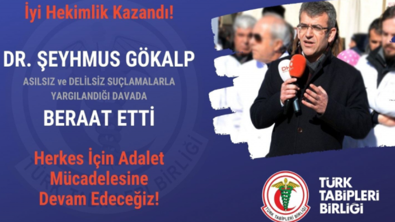 "Türk Tabipleri Birliği (TTB) Yüksek Onur Kurulu Üyesi ve 2014-2018 dönemi Merkez Konseyi Üyesi Dr. Şeyhmus Gökalp, asılsız ve delilsiz suçlamalarla yargılandığı ve 23 Kasım 2020’de tutuklanıp 10 Şubat 2021’de tahliye edildiği davanın karar duruşmasında beraat etti. Duruşmayı TTB Merkez Konseyi, TTB Yüksek Onur Kurulu ve TTB Etik Kurulu’nun mevcut ve geçmiş dönemlerdeki üyeleri, birçok ilden tabip odalarının başkanları ve yöneticileri ile emek ve meslek örgütlerinin temsilcileri ve milletvekilleri takip etti.