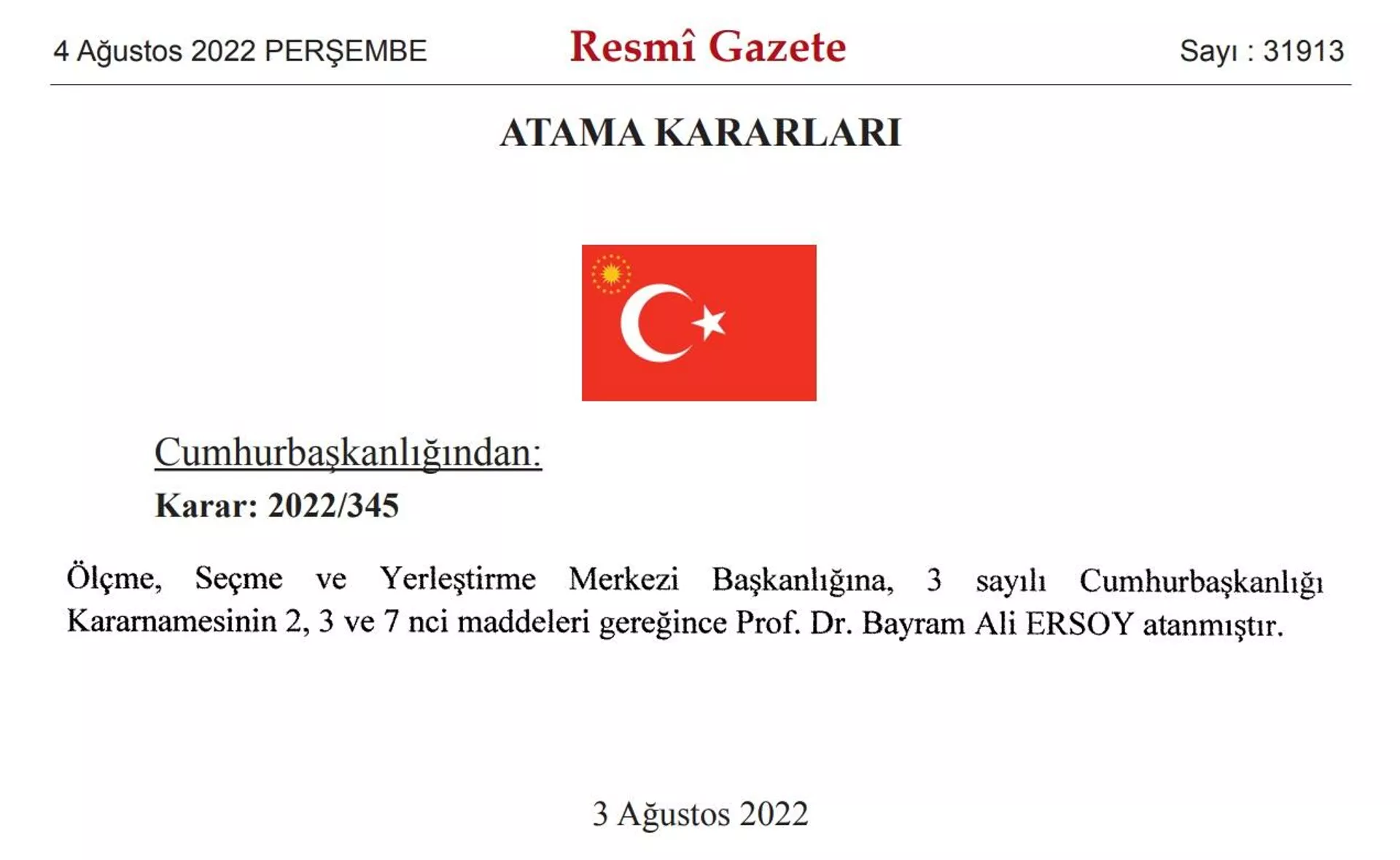 Cumhurbaşkanı Recep Tayyip Erdoğan'ın, ÖSYM Başkanlığına Prof. Dr. Ersoy'un atanmasına ilişkin kararı, Resmi Gazete'de yayımlandı.